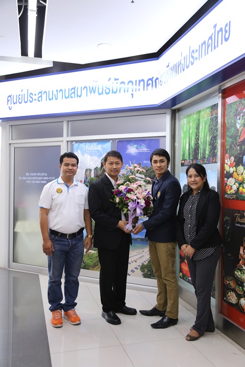 คุณชัยวัฒน์ เอมวงศ์ ผู้ช่วยกรรมการผู้จัดการด้านบริหารศูนย์การค้าและสำนักงาน บริษัท ซี.พี.แลนด์ จำกัด (มหาชน) ผู้บริหารศูนย์การค้าฟอร์จูนทาวน์ มอบกระเช้าดอกไม้แสดงความยินดีแก่ คุณพิสุทธิพัธ คลังทรัพย์ ผู้อำนวยการโครงการพัฒนาวิชาชีพ มัคคุเทศก์ มหาวิทยาลัยฟาร์อีสเทอร์น เนื่องในโอกาสเปิดบริการศูนย์ประสานงานสมาพันธ์มัคคุเทศก์อาชีพ แห่งประเทศไทย