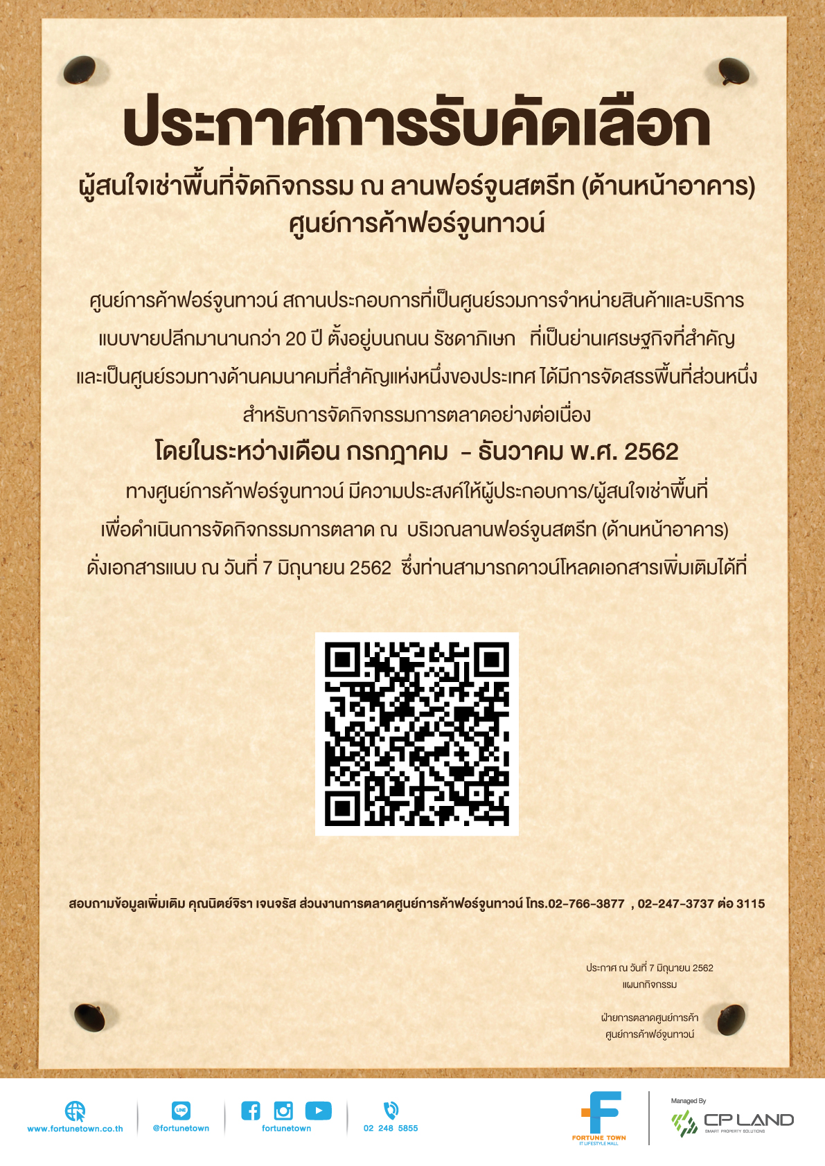 ประกาศการรับคัดเลือกผู้สนใจเช่าพื้นที่จัดกิจกรรม ณ ลานฟอร์จูนสตรีท (ด้านหน้าอาคาร) ศูนย์การค้าฟอร์จูนทาวน์
