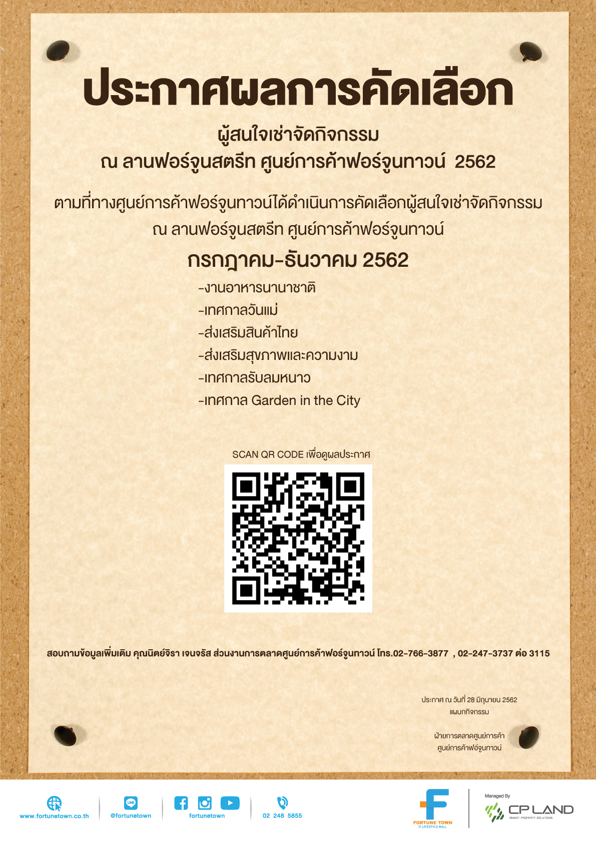 ตามที่ทางศูนย์การค้าฟอร์จูนทาวน์ได้ดำเนินการคัดเลือกผู้สนใจเช่าจัดกิจกรรม ณ ลานฟอร์จูนสตรีท ศูนย์การค้าฟอร์จูนทาวน์ กรกฎาคม-ธันวาคม 2562 ปรากฎผลดังนี้