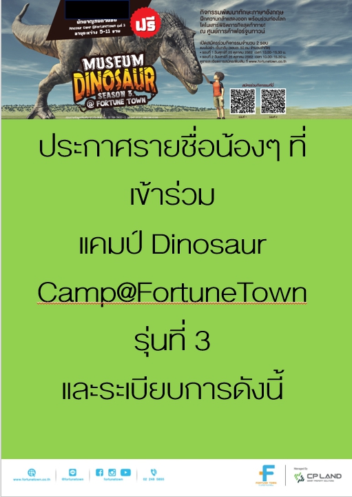 ประกาศรายชื่อน้องๆ ที่เข้าร่วมแคมป์ Dinosaur Camp@FortuneTown รุ่นที่ 3 และระเบียบการดังนี้