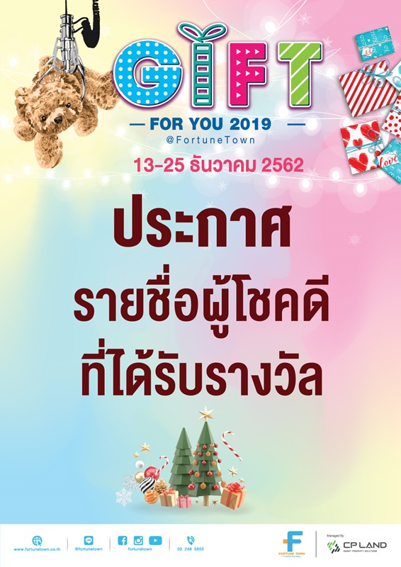 ประกาศรายชื่อผู้โชคดีได้รับรางวัลจากแคมเปญ Gift for You 2019 @ Fortune Town