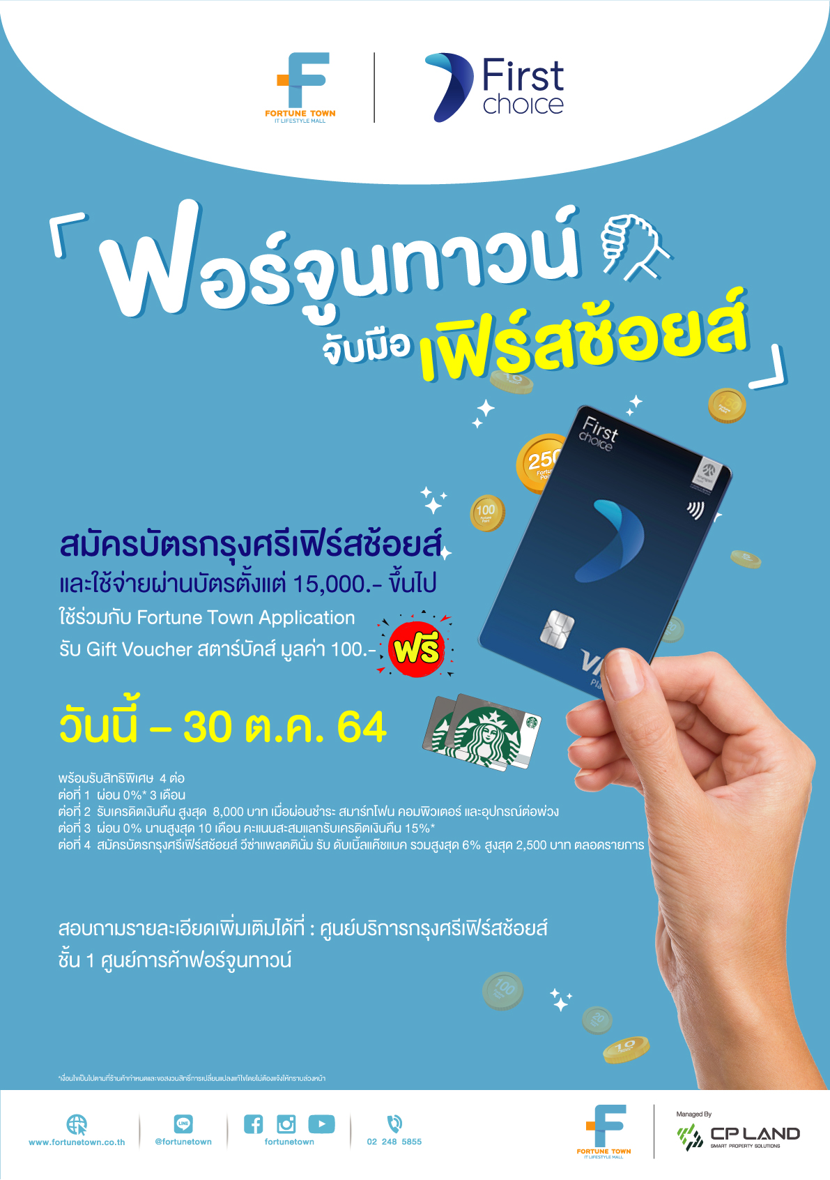 Fortune Town Application มอบสิทธิประโยชน์ เพียงสมัครบัตรกรุงศรีเฟิร์สช้อยส์และใช้จ่ายผ่านบัตร ตั้งแต่ 15,000 บาท ขึ้นไป รับ Gift Voucher สตาร์บัคส์ มูลค่า 100.- ฟรี ตั้งแต่วันนี้ - 30 ตุลาคม 2564